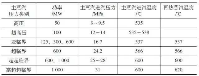 在374.15℃、22.115MPa压力下,水蒸气的密度会增大到与液态水一样,这个条件便是水的“临界参数”,比这还高的参数便叫作“ 超临界” , 如将温度升高到600℃,压力到25~28MPa,蒸汽就进入“超超临界”状态。从表1可见,随着进汽参数的逐步提高,机组功率也相应增大。同时蒸汽的温度和压力越高,发电效率就越高。一般来说,超临界机组的热效率比亚临界机组高2%~3%,超超临界机组的热效率比超临界机组又要高约4%。